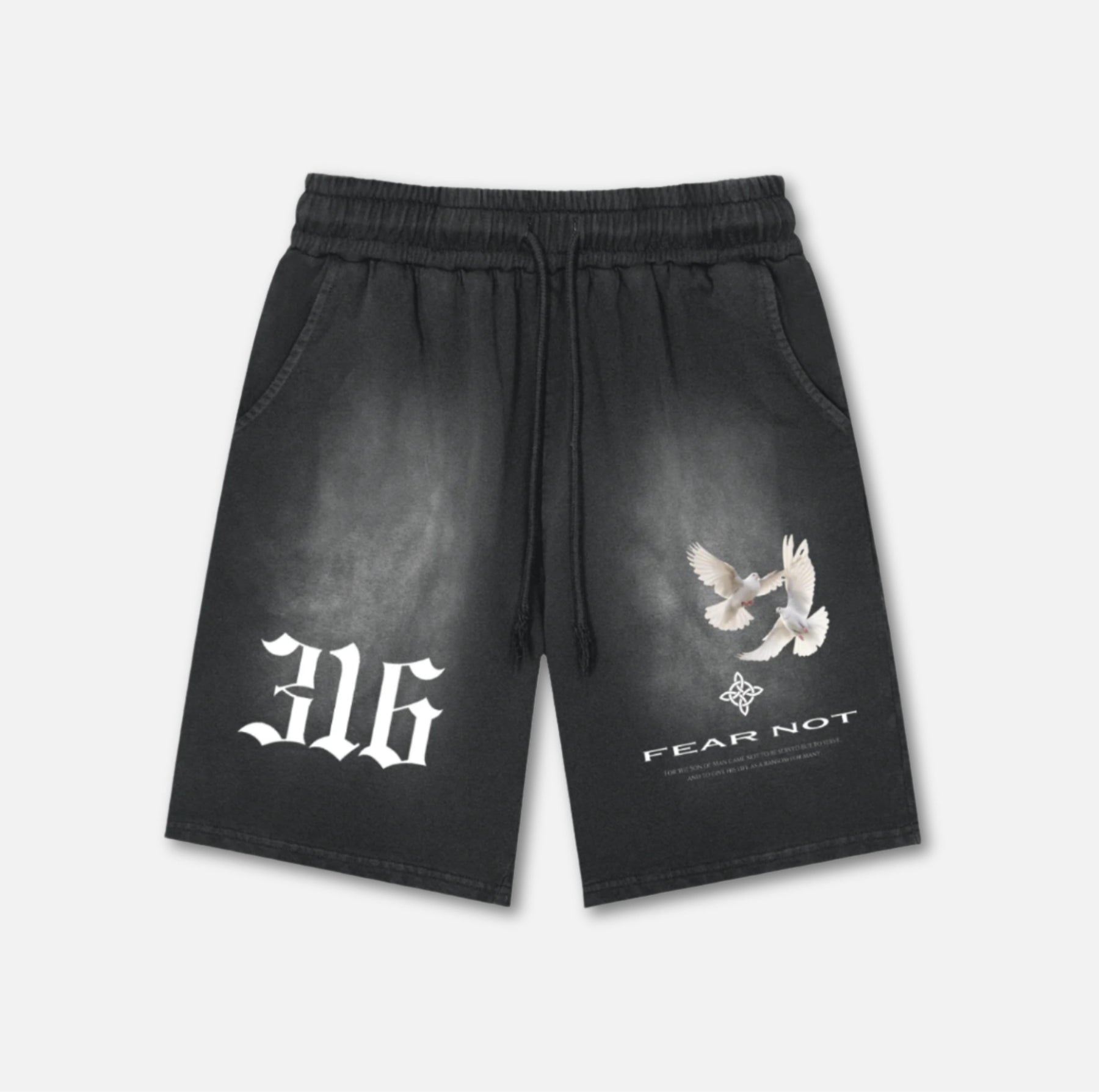 When God's love meets divine peace, everything changes. These heavyweight shorts feature "316" and dove motif on premium vintage-washed cotton—the greatest love story brought the deepest peace. Step into tranquility.
